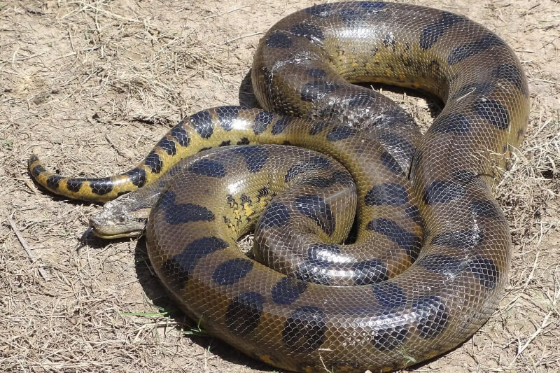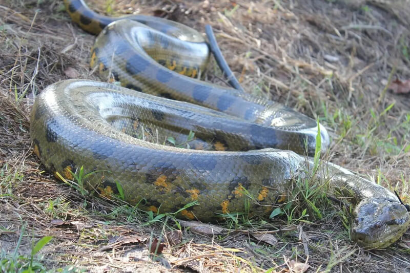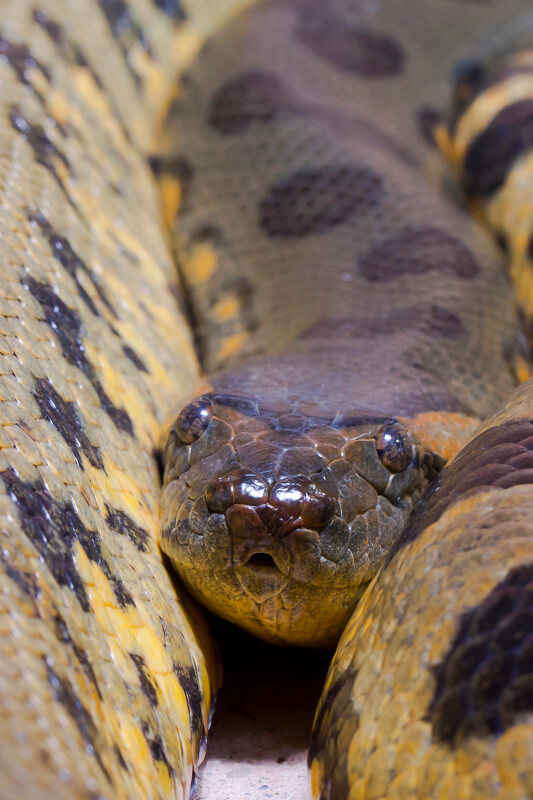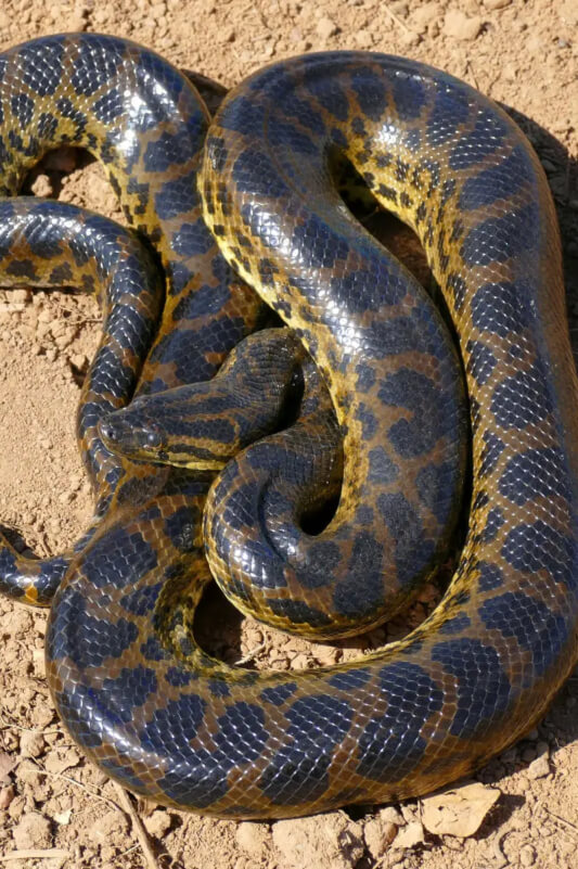 L’anaconda peut dépasser 5 mètres de long et atteindre un poids très élevé, ce qui en fait le serpent le plus lourd du monde. Son corps massif, de couleur vert olive tacheté de noir, lui offre un excellent camouflage dans les eaux troubles et la végétation dense. Contrairement aux serpents venimeux, il capture ses proies par constriction, à l’image du boa constricteur.