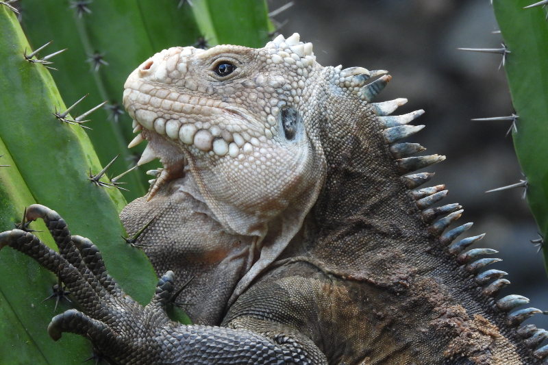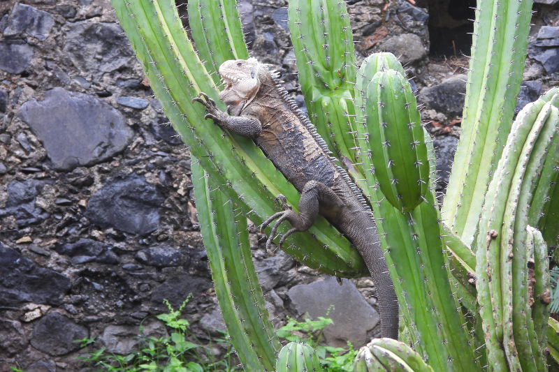 Contrariamente a algunas ideas preconcebidas, la iguana de las Antillas Menores no es agresiva. Ante el peligro, casi siempre prefiere la huida o la inmovilidad, confiando en su camuflaje para pasar desapercibido.